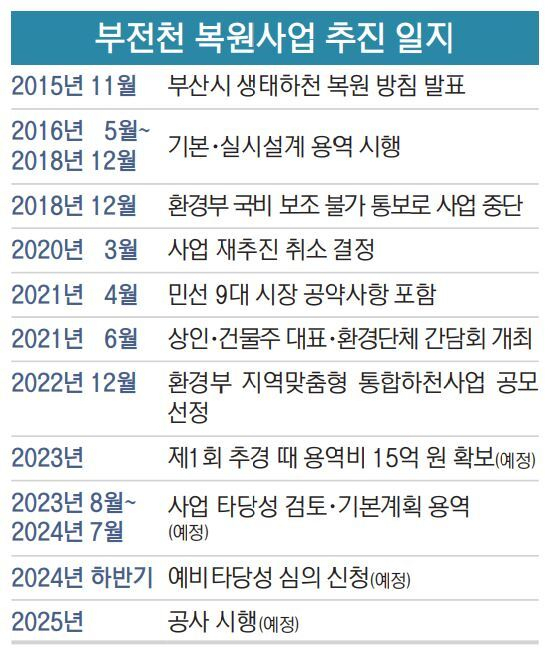시는 우선 올해 1차 추경 때 사업타당성 조사와 기본설계 용역비로 15억 원을 확보할 계획이다. 환경부와 기재부 협의를 거쳐 사업자 선정, 실제 착공까지 앞으로 2년가량이 더 걸릴 전망이다. 롯데백화점에서 광무교에 이르는 부전천 1차 복원사업 구간은 이르면 2025년 착공, 2년여의 단시간에 공사를 마쳐 주변 상권에 피해를 최소화할 계획이다.