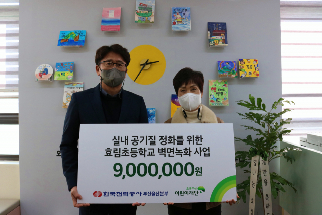 한국전력공사 부산울산본부(본부장 이경윤)는 최근 초록우산 어린이재단을 통해 공기질 정화와 탄소배출 저감을 위한 실내벽면녹화 사업 후원금 900만 원을 지원했다.