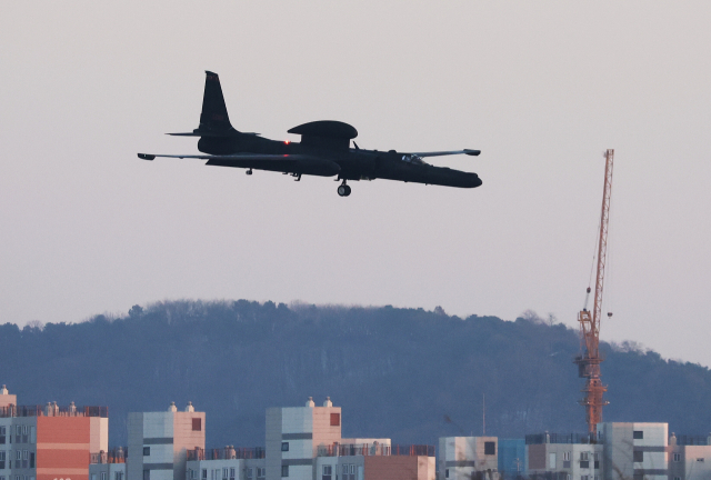 북한 인민군 창건 75주년을 앞두고 평양 미림 비행장 북쪽 열병식장에 1만 명이 넘는 병력이 집결해 있는 것으로 포착되고 있는 가운데 4일 경기도 주한미공군 오산기지에서 고공정찰기 U-2S가 착륙하고 있다. 연합뉴스