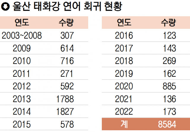 지난 23년 간 태화강에 방류한 어린 연어는 총 773만 7000마리로, 이 중 태화강에 돌아온 연어는 약 0.1%인 8584마리에 그쳤다.