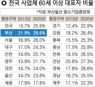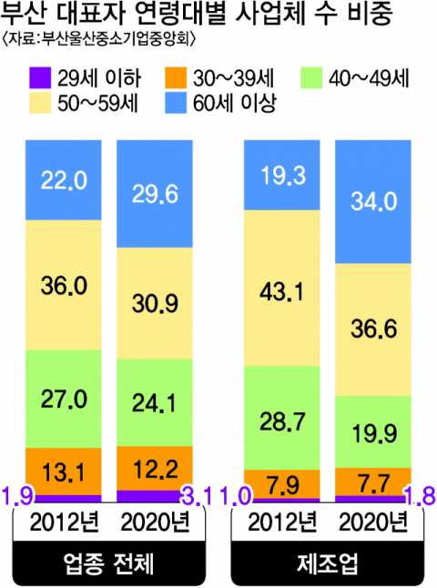 부산에서 60세 이상 대표자가 기업을 경영하는 ‘고령기업’ 비율이 전국에서 가장 높은 이유는 크게 두 가지다. 부산은 지난해 이미 ‘초고령사회’로 접어들어 65세 이상 인구가 20%를 넘는 인구 구조라 60대 이상 고령 기업인이 많을 수밖에 없다. 또 전체 산업 중 제조업이 차지하는 비중이 상대적으로 높은데, 제조업이 급속도로 경쟁력을 잃어 제조업을 물려받거나 새로 창업하는 비중이 작기 때문으로 분석된다.