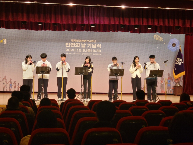중학생은 오카리나 공연에서 갈고 닦은 실력을 뽐내 성금을 모았다. 중학생 7명은 지난달 9일 부산시청에서 열린 인권의 날 기념식 행사에서 연주 공연을 펼쳤다. 연주를 마친 아이들은 공연비 6만 원을 받아 성금에 보탰다. 이렇게 16만 400원이 모였다.