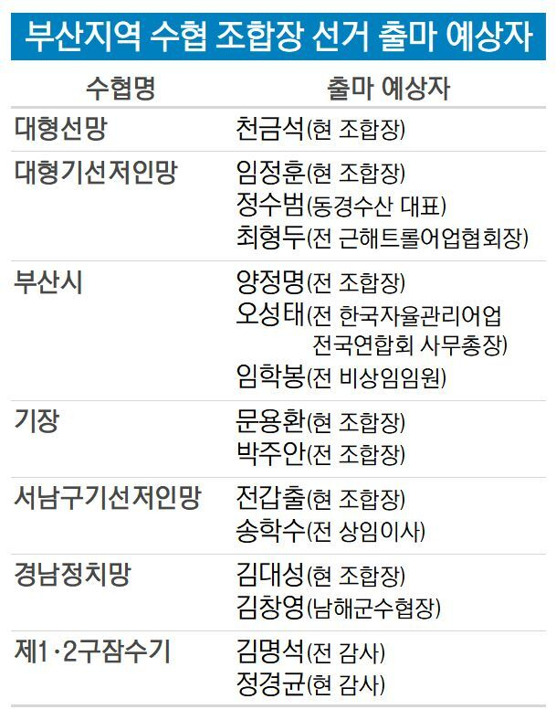 23개 어촌에 2632명의 조합원이 속한 부산시수협 선거는 ‘부산시장 선거의 축소판’이라고 불릴 만큼 선거 때마다 과열 양상을 빚었다. 출마 예정자로 거론되는 인물은 양정명(66) 전 부산시수협조합장, 오성태(66) 전 한국자율관리어업 전국연합회 사무총장, 임학봉(61) 전 부산시수협 비상임임원이다.