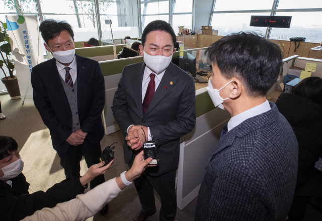 원희룡 국토교통부 장관이 지난 3일 서울 여의도 주택도시보증공사 서울서부관리센터에서 열린 ‘전세사기 관련 간담회’에 참석하기 앞서 직원들을 만나 대화하고 있다. 공동취재단 제공