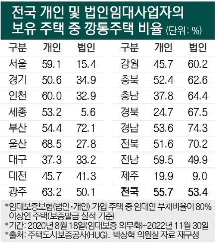 개인 임대사업자의 보유 주택 중 깡통주택 비율을 광역시·도별로 보면 울산(68.5%), 광주(63.2%), 인천(60.0%), 전남(59.5%), 서울(59.1%) 순으로 높았다.