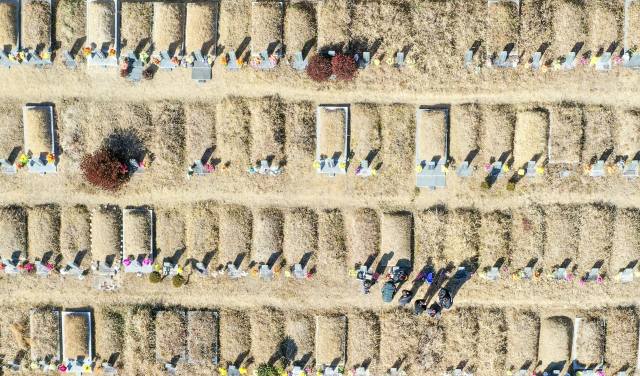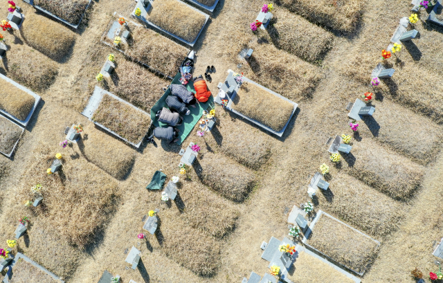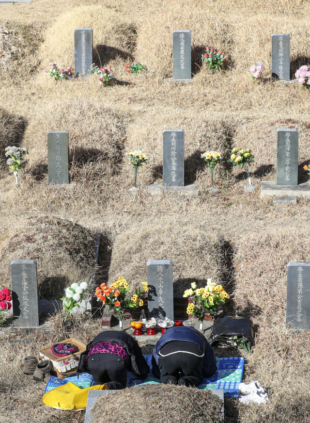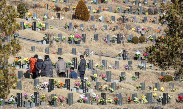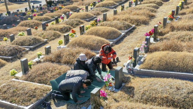 설을 2주 앞둔 8일 오전 부산 금정구 영락공원을 찾은 한 가족이 성묘를 하고 있다. 영락공원은 이번 설 연휴(21~24일) 동안 정상운영하고 참배시간은 오전 8시에서 오후 7시까지 2시간 연장 운영한다.코로나19 확산 방지를 위해 제례실은 폐쇄하며 제수 음식물 반입도 금지한다. 단 설 연휴 이전 평일에는 제사를 지낼 수 있다.