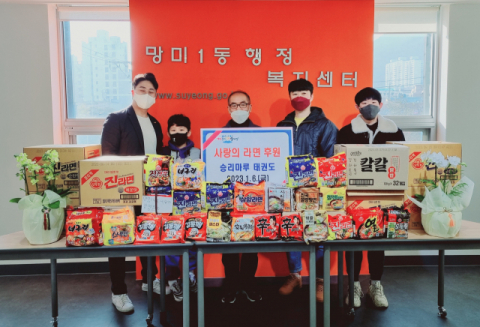 부산광역시 수영구 망미1동 행정복지센터(동장 김정오)는 지난 6일 승리마루태권도 배산·광안도장(관장 한영민)에서 2023년 새해를 맞아 태권도 지도팀과 원생들이 직접 가정에서 한 봉씩 모은 라면 및 컵라면 959개를 전달했다고 밝혔다.