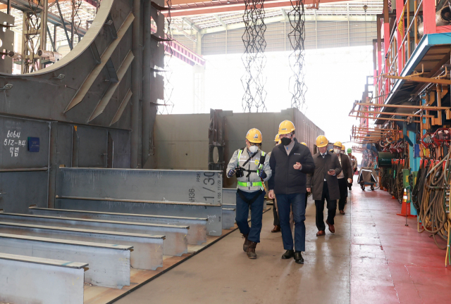 장영진 산업통상자원부 1차관이 9일 오후 경남 거제시에 위치한 대우조선해양 선박건조 현장을 방문, 우제혁 대우조선해양 소장(부사장)으로부터 회사 운영현황 및 애로사항을 청취한 후 선박건조 현장을 둘러보고 있다. 산업부 제공