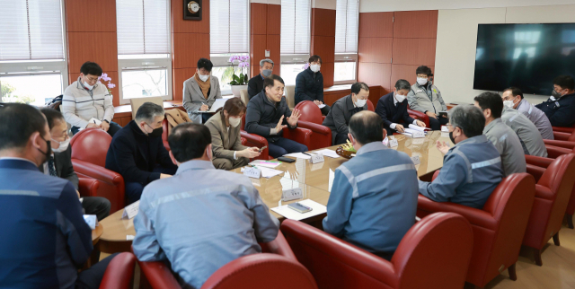 장영진 산업통상자원부 1차관이 9일 오후 경남 거제시에 위치한 대우조선해양 회의실에서 '조선업계 인력 현안 간담회'를 주재하고 있다. 간담회에는 최규종 조선해양플랜트협회 부회장, 나영우 경남조선해양기자재협동조합 이사장, 우제혁 대우조선해양 조선소장(부사장), 윤종현 삼성중공업 조선소장(부사장), 제영섭 건화 대표, 이헌국 삼녹 대표를 비롯한 조선업계 및 협·단체 관계자가 참석했다. 산업부 제공