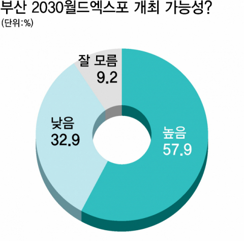 2030엑스포 유치 ‘가능성이 높다’는 판단이 57.9%로 ‘낮다’는 판단(32.9%)에 비해 높게 나타난 것은 긍정적인 신호로 해석된다. 그동안 부산과 정부가 적극적으로 유치 활동을 펼친 덕분에 적어도 부산 시민들은 2030엑스포 부산 유치를 상당히 긍정적으로 바라보는 셈이다.