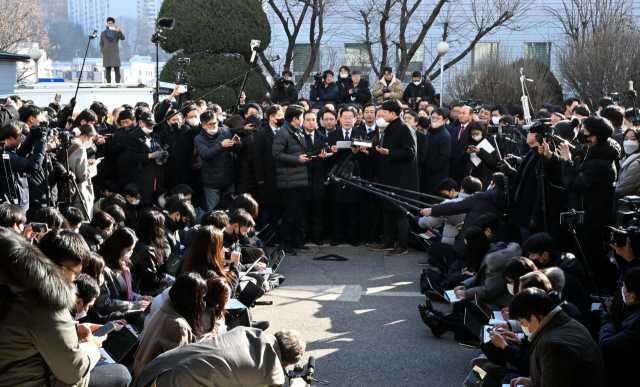 더불어민주당 이재명 대표가 ‘성남FC’ 사건으로 검찰에 출석한 10일 수원지검 성남지청 앞에서 입장을 발표하고 있다. 연합뉴스