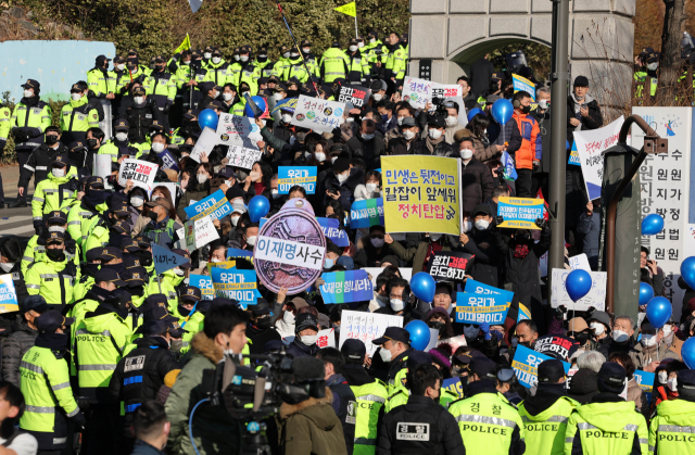 더불어민주당 이재명 대표 지지자들이 집회를 열고 있다. 연합뉴스