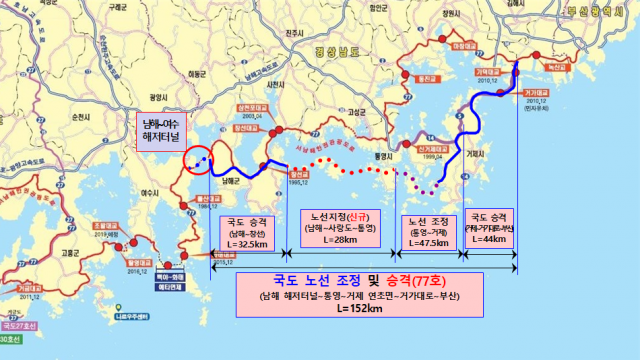 도는 이미 남해안 관광인프라 구축을 위해 남부내륙철도와 가덕도 신공항 건설, 아일랜드 하이웨이 건설에 나선 상태다. 특히 아일랜드 하이웨이는 전남 여수~남해~통영~거제~부산에 걸친 남해안 주요 섬을 교량으로 연결하는 사업이다. 현재 미연결 구간인 남해~여수 구간 국도 77호선 공사가 올해 하반기 착공 예정이다.