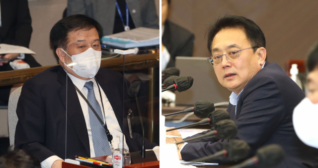 내년 22대 총선을 앞두고 부산 정치의 중심 역할을 해 온 동래구가 전·현직 국회의원 갈등 이슈로 뜨겁다. 이진복 대통령실 정무수석이 국회에 출석해 의원들의 얘기를 듣고 있다(왼쪽). 국회 정무위원회 현장 시찰에서 국민의힘 김희곤 의원이 질의를 하고 있다. 연합뉴스·정대현 기자 jhyun@