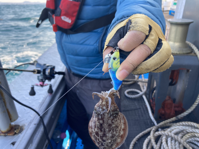 갑자기 폭증한 입질의 비결은 에기에 있었다. 이날 제주도 갑오징어 특효라는 삼봉에기는 신통찮았다. 대신 2.5호 정도의 표면이 매끈한 레이저 에기나, 래틀(딸랑이)이 들어있는 슈퍼브라이트하이어필 에기가 갑오징어의 맘에 쏙 들었던 모양. 에기를 바꿀 때마다 입질을 받는 김 회장에게 전갱이색 소형 에기 하나를 빌렸다. 그리고 네 번째 갑오징어를 드디어 올렸다.
