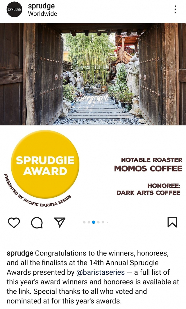모모스커피가 ‘2022 스프럿지 어워드’에서 ‘올해의 로스터’로 선정됐다는 사실을 알리는 미국 커피 매체 ‘스프럿지’의 인스타그램.