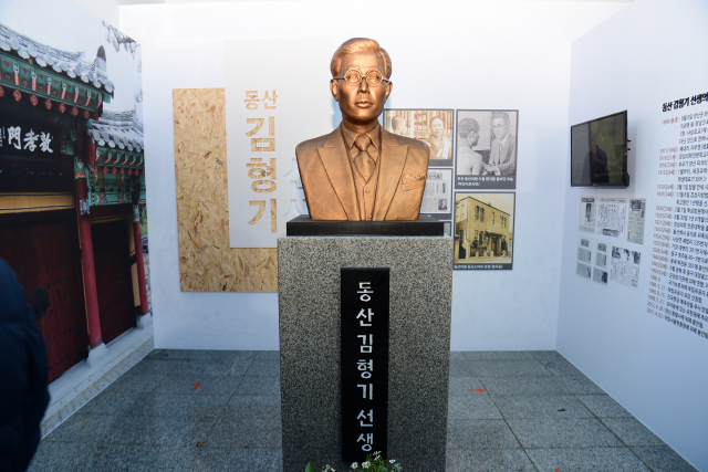부산 사상구청은 13일 모라동 유헌재에 동산 김형기 선생 기념관이 개관했다고 15일 밝혔다. 사진은 기념관 입구에 설치된 1.8m 높이 김 선생의 흉상 모습. 부산 사상구청 제공