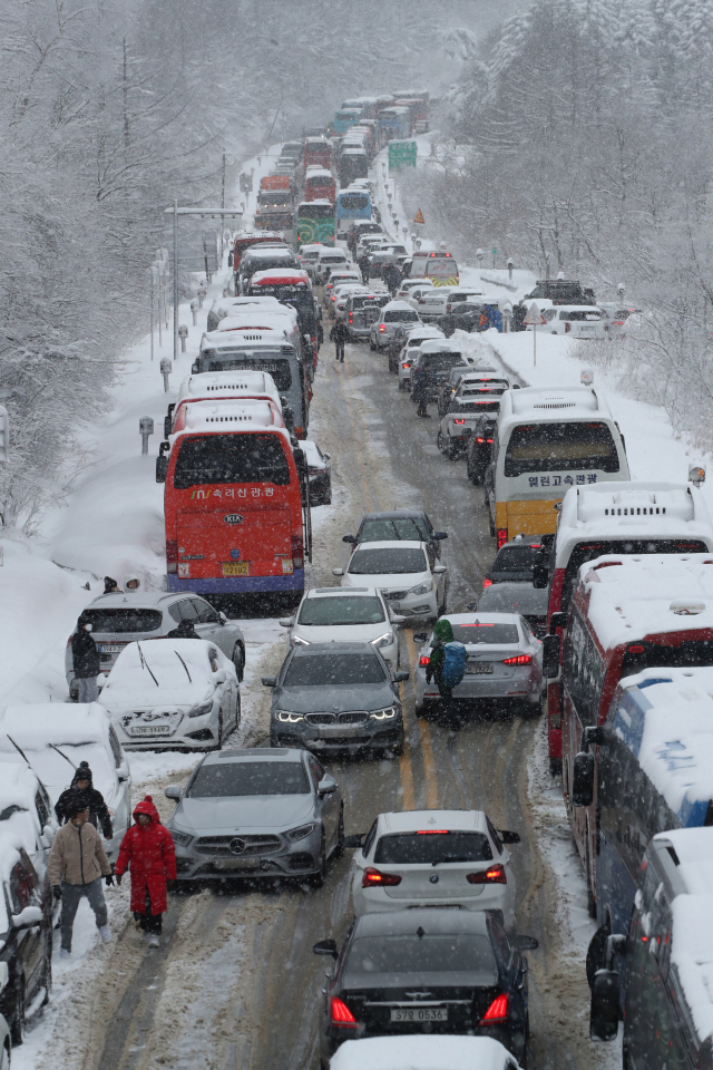 영동 지방에 대설 경보가 내려진 가운데, 15일 강원도 평창군 옛 영동고속도로 대관령 구간 도로가 폭설에다 등산객을 태우고 온 대형버스 등이 뒤엉키면서 마비 상태를 보이고 있다. 연합뉴스