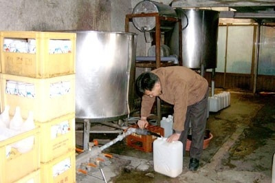 1990년대 산청양조장에서 말통에 술을 받고 있는 김대환 씨. 산청양조장 제공