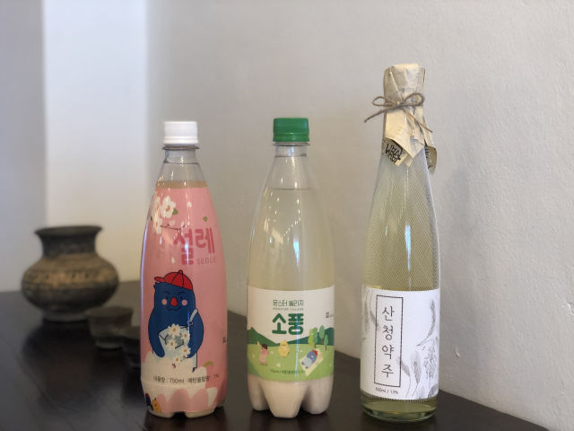 산청양조장의 '산청약주'와 몬스터빌리지의 '소풍' '설레' 막걸리(오른쪽부터).