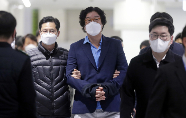 8개월간 도피 끝에 태국에서 붙잡힌 김성태 전 쌍방울그룹 회장이 17일 인천국제공항을 통해 입국해 수원지방검찰청으로 압송되고 있다. 연합뉴스