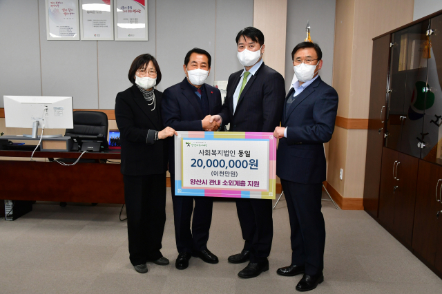 양산시(시장 나동연)는 동일스위트(사장 김은수)에서 17일 양산시장실을 방문해 설날 이웃돕기 성금 2000만 원을 기탁했다고 밝혔다.