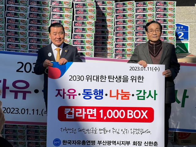 한국자유총연맹 부산광역시지부 신한춘 회장은 지난 11일 설 명절을 맞이해 동구노인복지관에 500만 원 상당의 사랑의 라면을 전달했다.