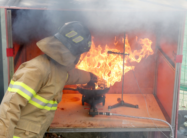 18일 부산소방재난본부에서 설 명절을 앞두고 ‘튀김 조리 중 발생하는 화재 위험성 및 대처방법에 대한 화재 재현실험을 실시했다. 실험에 참여한 소방관이 불이 난 튀김유에 냄비 뚜껑을 덮어 불길을 잡고 있다. 정대현 기자 jhyun@