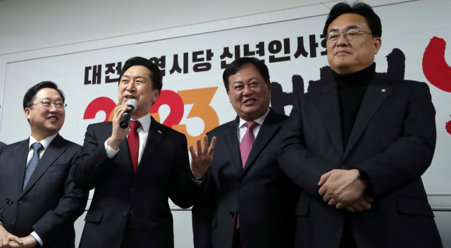 국민의힘 김기현 의원이 당대표 적합도 여론조사에서 오차범위 밖 1위를 차지하는 등 대세를 굳히는 모습이다. 김 의원이 18일 대전 중구 국민의힘 시당 사무실에서 열린 신년 인사회에서 인사말을 하고 있다. 연합뉴스