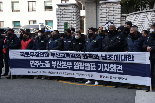 민주노총 부산지역본부는 18일 오전 11시께 동구 초량동 국토교통부 부산지방국토관리청 앞에서 기자회견을 열고 “명문초 개교 지연과 관련해 노조 파업을 원인으로 지목하는 것이 부당하다”며 원 장관과 하 교육감의 사퇴를 촉구했다.