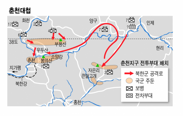 춘천대첩은 1950년 6월 25~27일 국군 제6사단 제7연대, 제19연대가 북한군 제2군단 소속 제2사단에 맞서 전개한 방어전이다. 당시 국군뿐만 아니라 경찰, 학생, 제사공장의 여공을 비롯한 수많은 시민이 북한의 기습 공격을 막는 데 함께 나섰다. 병력 열세를 딛고 ‘24시간 내에 춘천을 점령해 수원 방면으로 기동, 국군을 포위한다’는 북한의 목표를 좌절시키는 전과를 거뒀다.