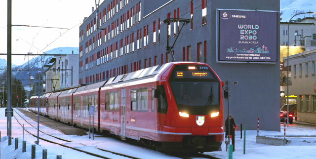 다보스포럼으로 불리는 세계경제포럼(WEF) 연차총회를 맞아 18일 삼성전자가 스위스 다보스 중심가 반호프슈트라세에 ‘2030 부산세계박람회’ 응원 메시지를 담은 옥외광고를 설치했다. 반호프슈트라세는 각국 정상 차량이 거쳐 가는 곳이다. 삼성전자 제공