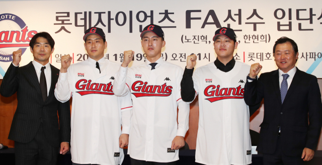 롯데 자이언츠는 19일 롯데호텔부산에서 FA로 영입한 유강남(왼쪽 두번째부터)·노진혁·한현희의 공식 입단식을 열고 2023시즌 좋은 활약을 다짐했다. 성민규(왼쪽) 단장과 박흥식 수석코치(오른쪽)가 함께 파이팅을 외치고 있다. 이재찬 기자 chan@