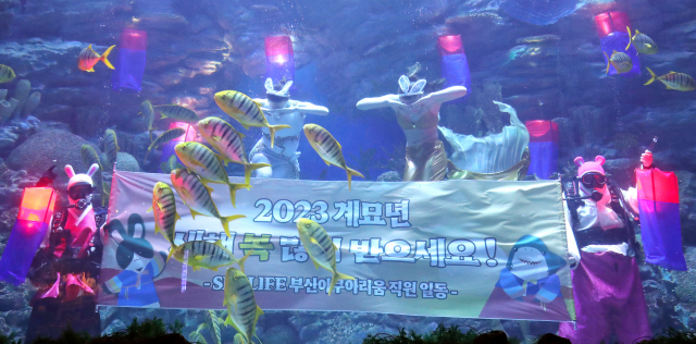 설 명절을 앞두고 9일 부산 해운대구 씨라이프 부산아쿠아리움에서 아쿠아리스트들이 청사초롱으로 꾸며진 수조에서 관람객에게 설 인사를 하고 있다.