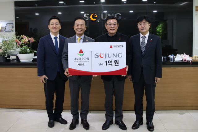 의류 제조기업 (주)세정(회장 박순호)이 성금 1억 원을 전달하며 부산사회복지공동모금회(회장 최금식, 이하 부산사랑의열매)의 기업 고액 기부자 모임인 ‘나눔명문기업’의 50번째 회원이 됐다.