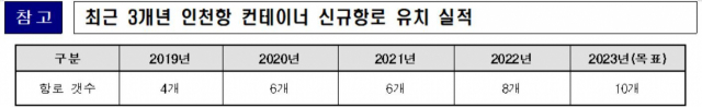 국내외 낮은 경제성장률 전망, 컨테이너 운임지수 하락 등 해운항만 물류 시장이 큰 폭으로 성장하기 어려운 요인이 있지만, △대규모 컨테이너 신조 선박의 시장 유입 △중국의 코로나 정책완화 가능성 등을 고려해 시장 변화에 민첩하게 대응할 수 있도록 상시 모니터링 체계를 구축하고, 이를 바탕으로 마케팅 활동에 집중하면 인천항에는 또 다른 기회가 될 수 있다고 보고 있다. 특히 지난해 11월 선보인 인천항 마케팅지원센터(물류비 비교견적 서비스) 이용을 확대해 수도권 및 중부권역 수출·입 화주의 물류비 절감을 유도하고, 이들 화물을 추가 유치함으로써 인천항 물동량 증가로 이어지게 할 계획이다.