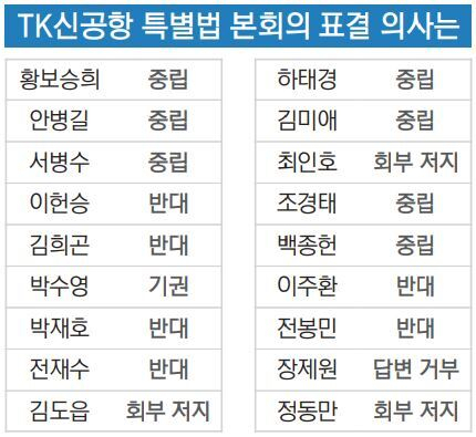 하지만 국민의힘 일부 의원은 “신중한 검토가 요구된다”(김미애 의원), “소관 부처와의 협의가 필요하다”(조경태 의원) 등 ‘중립적’ 평가를 내렸다. 이들은 TK신공항 특별법의 ‘중추공항 건설’ ‘최대중량 항공기 이착륙 활주로’ 등의 조항에도 ‘협의’나 ‘검토’를 언급하며 분명한 입장을 밝히지 않았다.