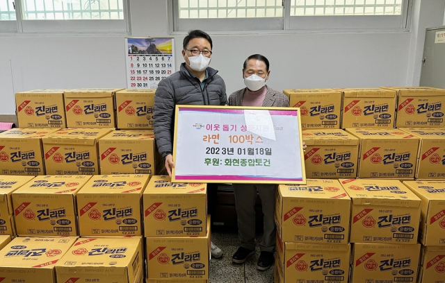 (주)화현종합토건(대표 김정수)는 최근 어려운 이웃을 위해 부산 수영구 수영동행정복지센터(동장 박해원)에 200만 원 상당의 라면을 후원했다.