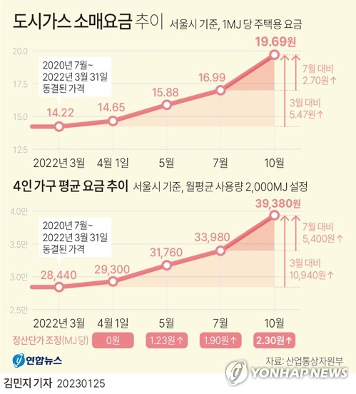 지난해 가스 도매요금은 주택용을 기준으로 네 차례(4·5·7·10월)에 걸쳐 1메가줄(MJ·가스 사용 열량 단위)당 5.47원 올랐다. 1년 새 인상률이 42.3%에 달했다.