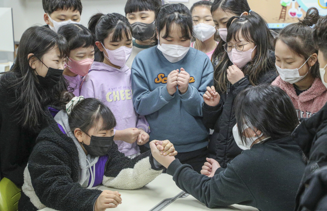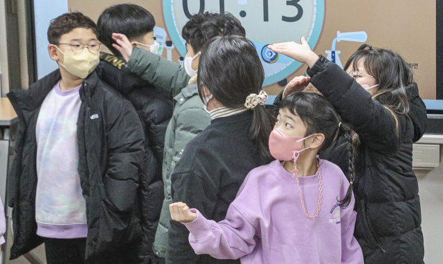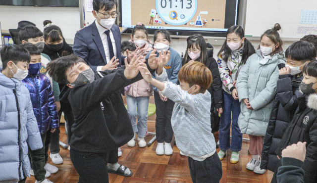 부산지역 대다수 초등학교가 겨울방학을 마치고 개학을 한 26일 오전 부산 강서구 명일초등학교에서 등교를 한 학생들이 교실에서 열린 실내 체육 활동 중 손바닥 밀어내기를 하며 즐거운 시간을 보내고 있다.
