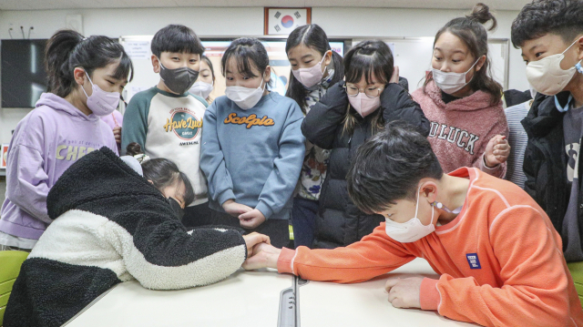 부산지역 대다수 초등학교가 겨울방학을 마치고 개학을 한 26일 오전 부산 강서구 명일초등학교에서 등교를 한 학생들이 교실에서 열린 실내 체육 활동 중 팔씨름을 하며 즐거운 시간을 보내고 있다.