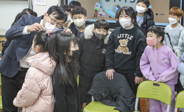 부산지역 대다수 초등학교가 겨울방학을 마치고 개학을 한 26일 오전 부산 강서구 명일초등학교에서 등교를 한 학생들이 방학동안 자란 키를 재고 있다.