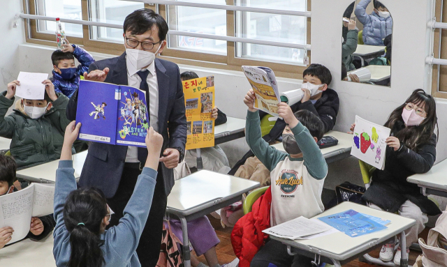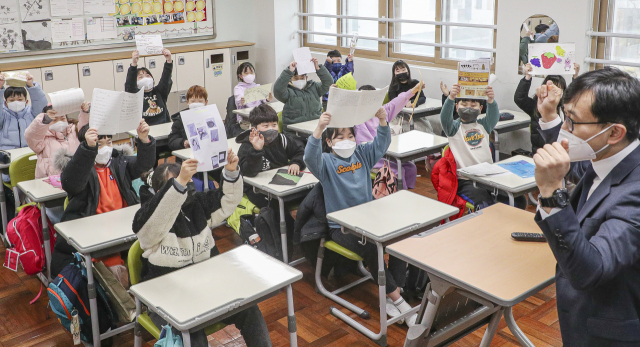 부산지역 대다수 초등학교가 겨울방학을 마치고 개학을 한 26일 오전 부산 강서구 명일초등학교에서 등교를 한 학생들이 방학 숙제를 들어 보이고 있다.
