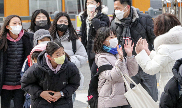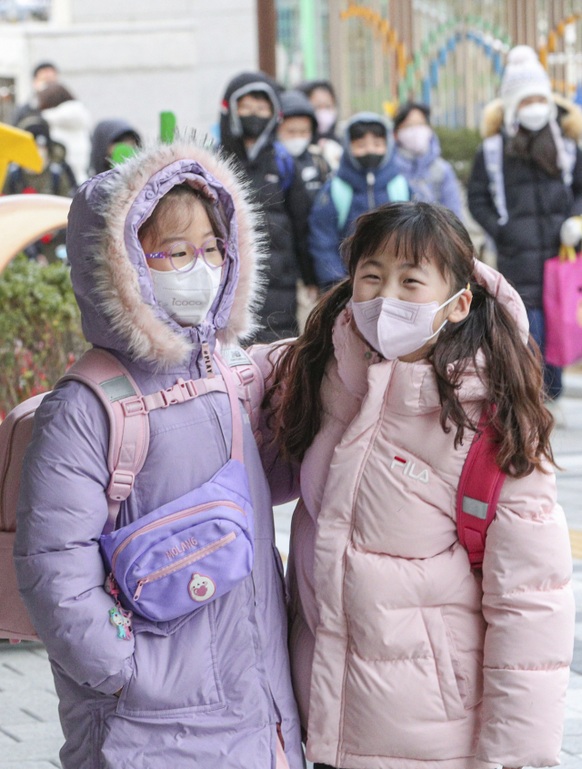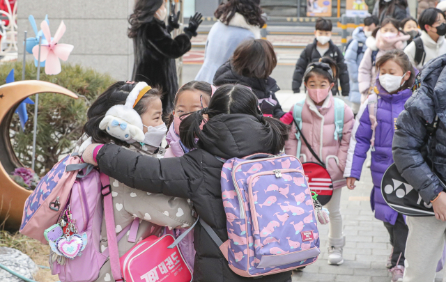 부산지역 대다수 초등학교가 겨울방학을 마치고 개학을 한 26일 오전 부산 강서구 명일초등학교에서 학생들이 등굣길에 친구들을 만나 반갑게 인사하고 있다.