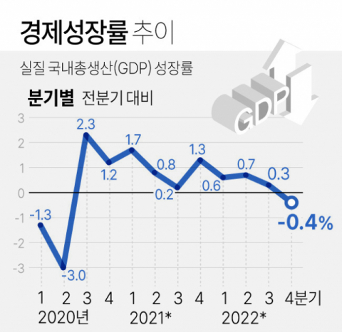 한국은행은 2022년 4분기 실질 국내총생산(GDP) 성장률(직전분기 대비·속보치)이 -0.4%로 집계됐다고 26일 발표했다. 한국 경제 분기 성장률이 마이너스를 기록한 것은 코로나19 여파가 본격화했던 2020년 2분기(-3.0%) 이후 10분기 만이다.