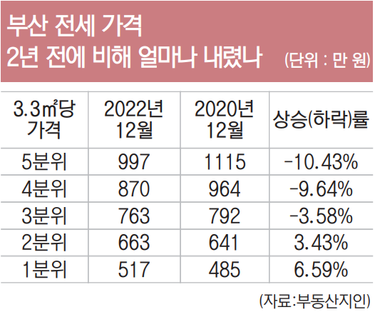 수영구의 한 부동산 관계자도 “최근에는 30평형대 기준으로 4억~5억 원이면 '괜찮은' 아파트에 전세로 갈 수 있다. 1~2년 전 아파트 가격이 급등하던 시기에는 어림도 없었다. 그때와 비교해 체감적으로는 1억~2억 원 빠진 느낌”이라며 “임차인들도 학교 등의 문제만 없다면 같은 가격에 상급지 쪽으로 전세를 옮기려 하지 굳이 전세를 연장하지 않는다”고 말했다.