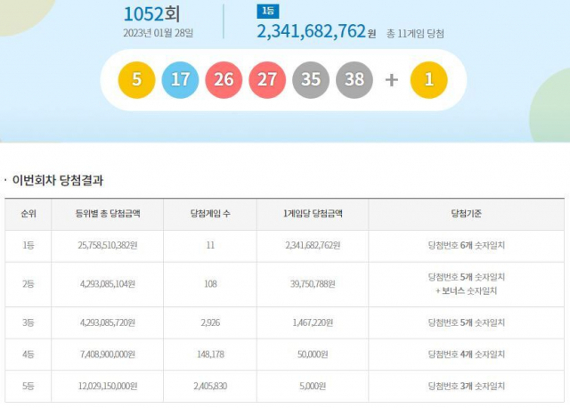 28일 제1052회 동행복권 로또 추첨 결과 1등 당첨번호로 ‘5, 17, 26, 27, 35, 38’가 뽑혔다. 2등 보너스 번호는 ‘1’이다.