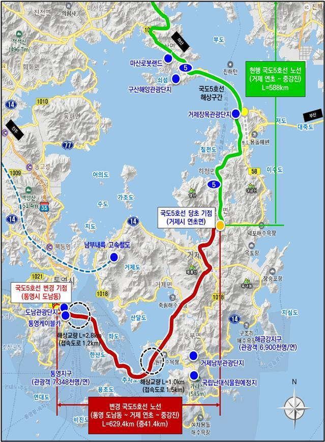 명진터널 상행선(2차로 1.6km)과 거제 동부면 가베리~통영 추봉도~한산도 본섬~도남동 국도 신설(교량 2개소 3.8km, 접속도로 5.2km)은 2021년 6월 공표된 국도 5호선 연장 지정령에 근거한 프로젝트다. 사업비는 각각 450억 원, 6350억 원이다. 인근 조성될 한‧아세안국가정원이 2030년 완성되는 만큼 제6차 국도‧국지도 건설 5개년(2026~2030) 계획에 반영돼야 한다는 게 거제시의 판단이다.