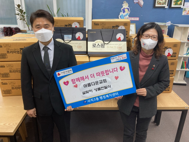 부산 사직3동 대한예수장로회 아름다운 교회(담임목사 김성식)는 최근 어려운 이웃을 위해 동 행정복지센터(동장 심인자)에 명절선물 세트 75개를 기탁했다.