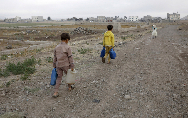 28일(현지시간) 예멘 수도 사나 외곽에서 어린이들이 등교 전 기부 받은 물로 채운 물통을 들고 걷고 있다. 8년간 내전으로 예멘 어린이 1000만 명 이상이 식량 부족 등에 허덕이고 있다. EPA연합뉴스
